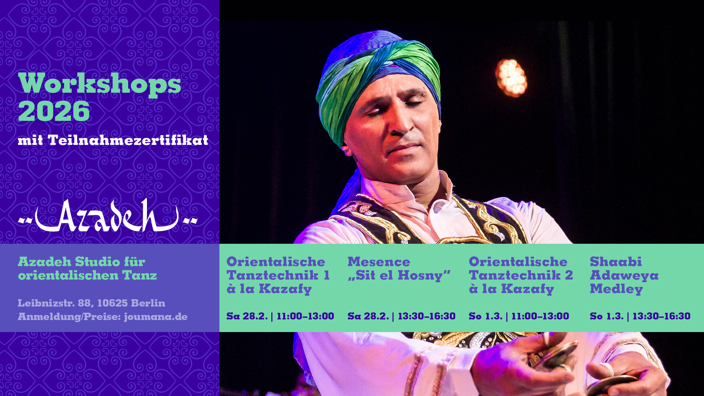 2026-01-12Workshop with Kazzafy 28. Feb. & 1. MärzSat, Feb. 28, 11:00 AM - 1:00 PM: Oriental Dance Technique 1: 45,- / 50,- € *